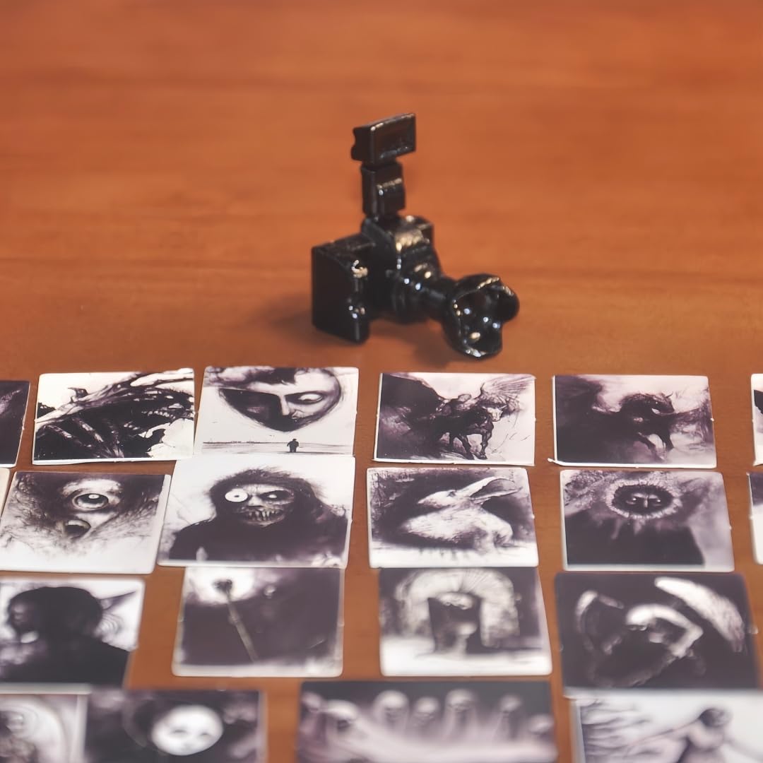 - Centerpiece Miniature DSLR Camera Prop: Features a realistic, miniature black DSLR camera (perfect 1:6 scale detective or paranormal investigator prop) plus dozens of unique miniature darkened horror posters & abstract charcoal art pieces.