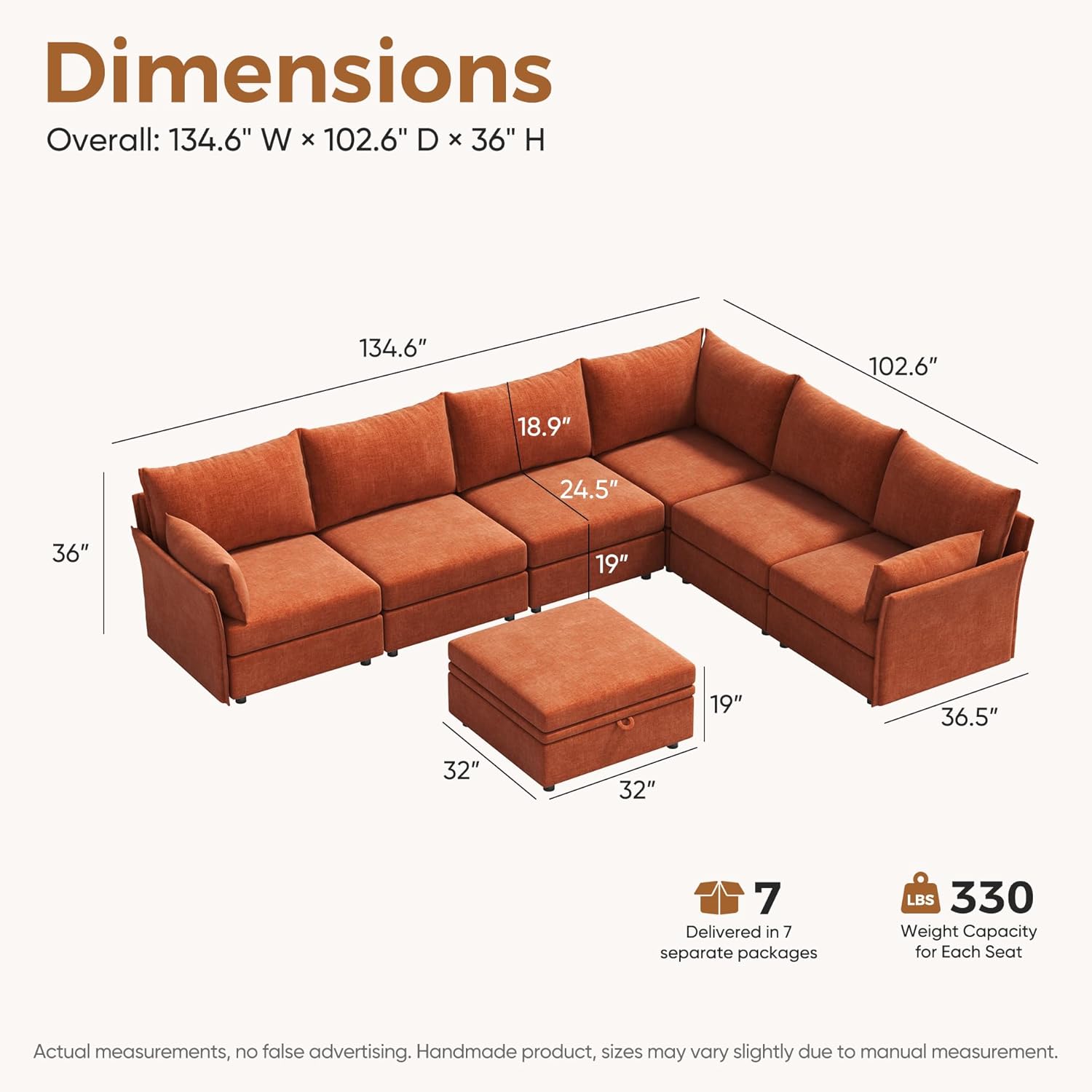 - đź’ˇ Stylish and Spacious Sectional Sofa - A blend of modern elegance and comfort, this terracotta sofa is ideal for contemporary interiors. Customize seating and shape by adding or removing modules to fit your needs. It's perfect for your living room, family room, bedroom, or office. Overall size: 134.6" W Ă— 102.6" D Ă— 36" H, seat width: 32", seat depth: 24.5".