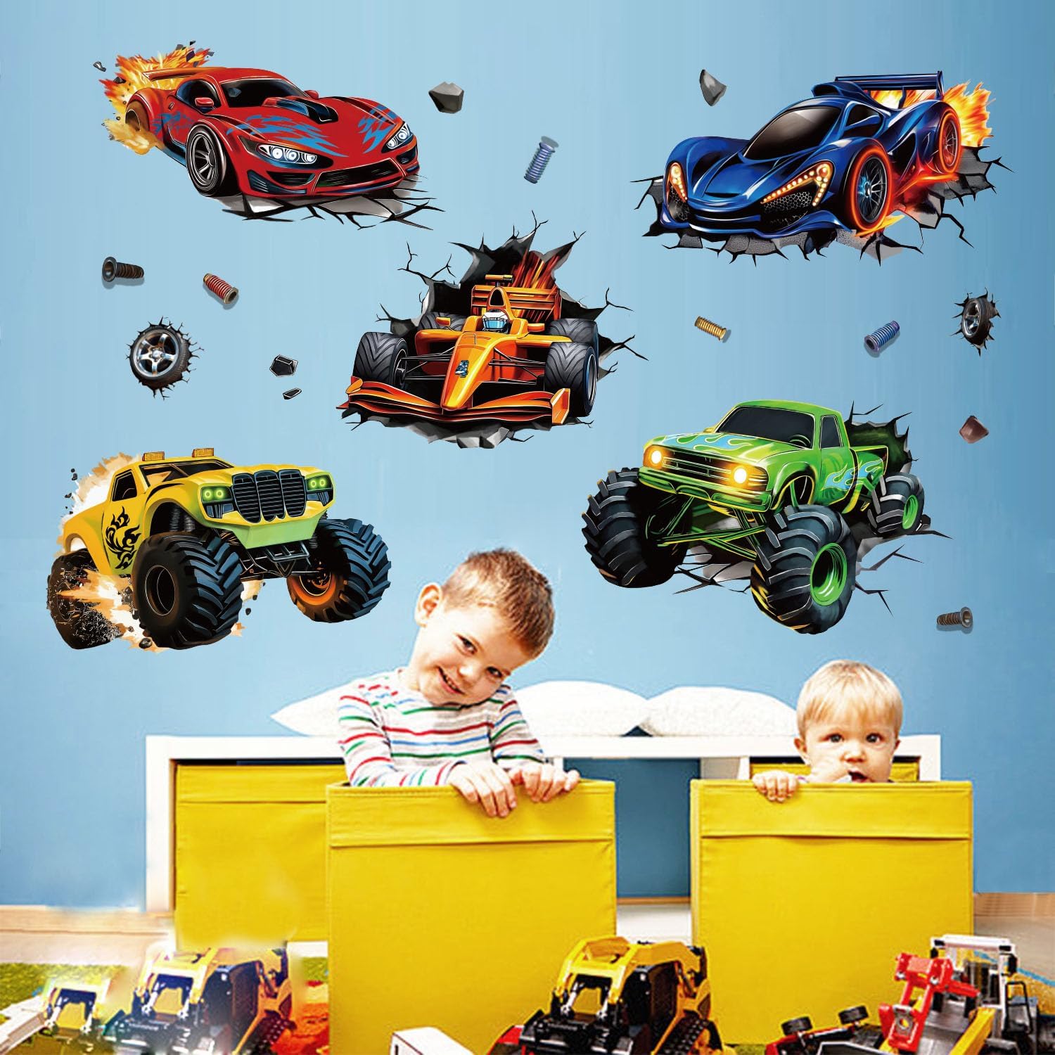 3D Racing Cars Wall Decals - Truck Bursting Through Wall, F1 Racing Cars Wall Stickers for Kids Room Boys Bedroom