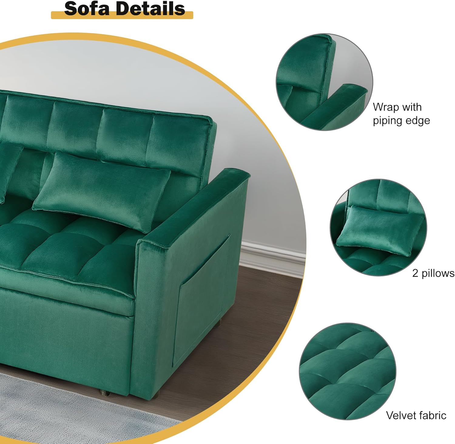 3 in 1 Sleeper Sofa Bed, Futon Sofa Bed for Living Room with Side Pocket, Green Sleepers Sofas Couch with Pullout Beds, Convertible Love Seat Sleepers Couch for Living Room, Bedroom