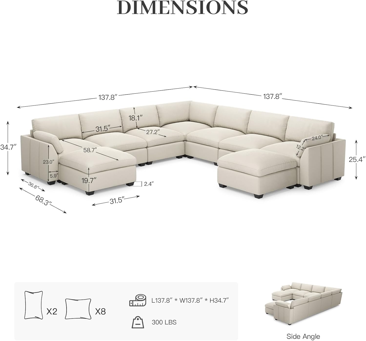 - Extra Deep Seat Sofa: The Belffin sofa’s general dimension is 137.8"D x 137.8"W x 34.7"H. Each individual seat measures 31.5" in width and 36" in depth. The super-sized seating with wide and deep cushions offers you deep comfort. The sectional sofa's generous design, with coordinated colors, is suitable for various scenarios