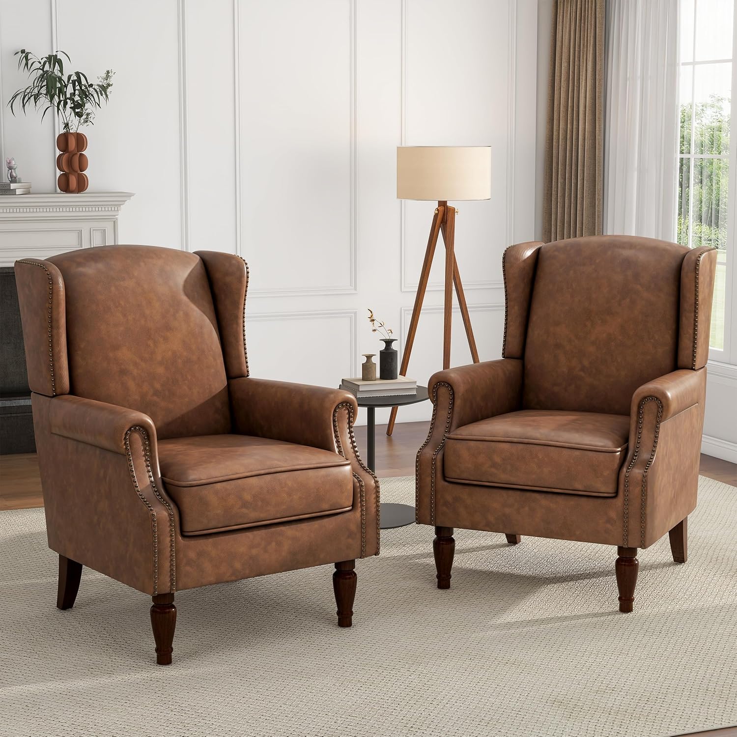 UIXE PU Leather High Back Accent Chairs Set of 2, Upholstered Armchair for Living Room, Retro Wingback Arm Chair Nailhead Trim Single Sofa Bedroom Reading Seat - Brown
