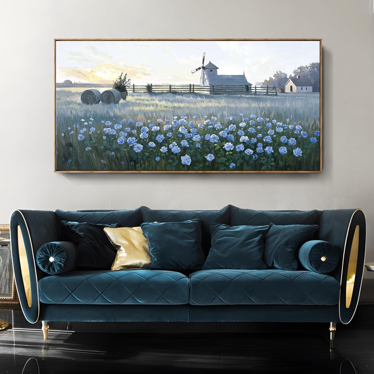 - Rustic Charm in Full Bloom: Elevate your space with this extra large blue floral windmill framed canvas art, capturing the gentle beauty of country living. A dreamy landscape of blue countryside blossoms unfolds under a glowing sky, while a classic farmhouse and tall windmill anchor the scene in pastoral elegance. Perfect for creating a tranquil focal point in your living room, above the bed, or large entryway.