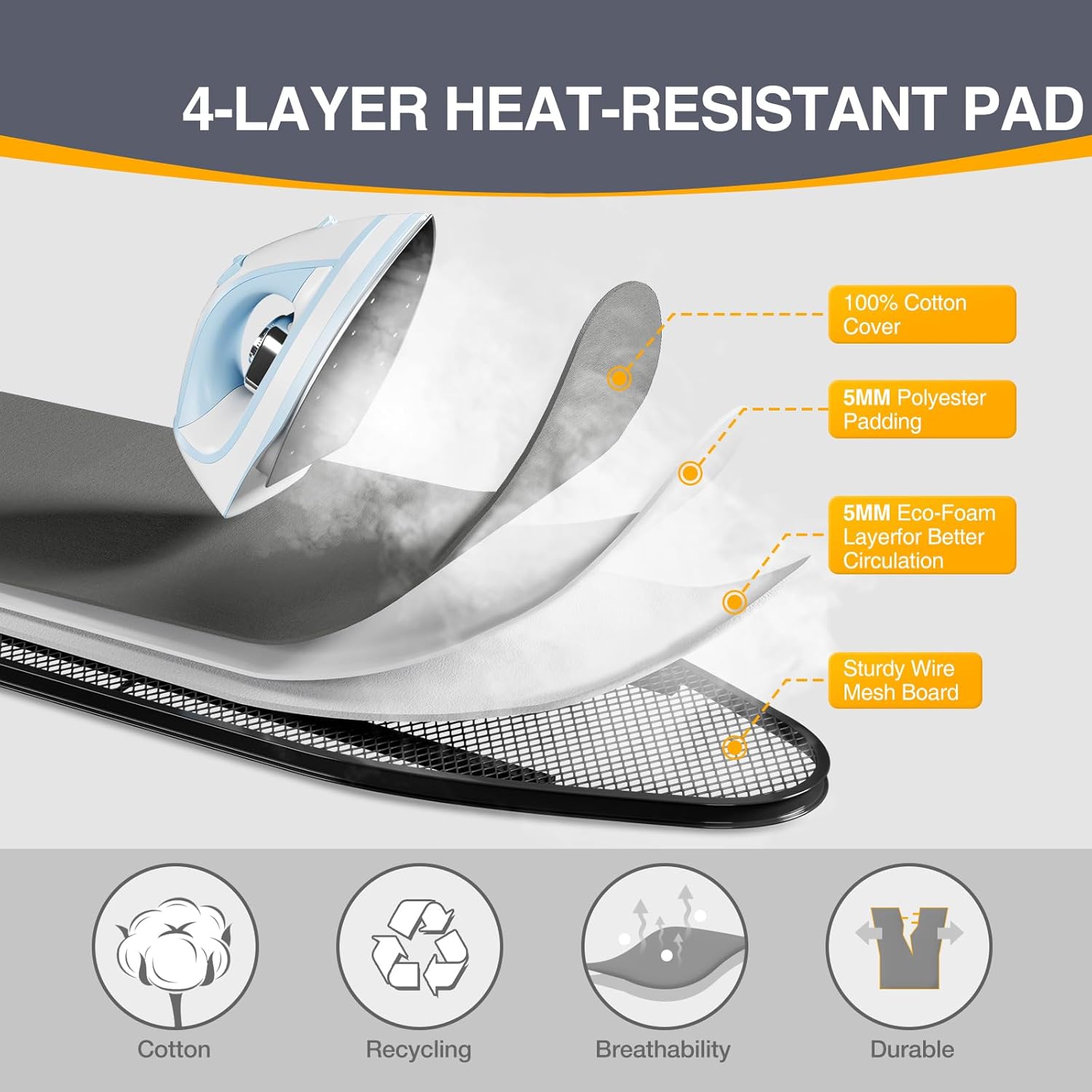 - 3-Layer Ultra-Thick Padding -Enjoy premium protection with a thick, three-layer padded cover that provides excellent cushioning and steam absorption. The special heat-resistant coating shields your garments from scorching and ensures smooth gliding and even heat distribution.