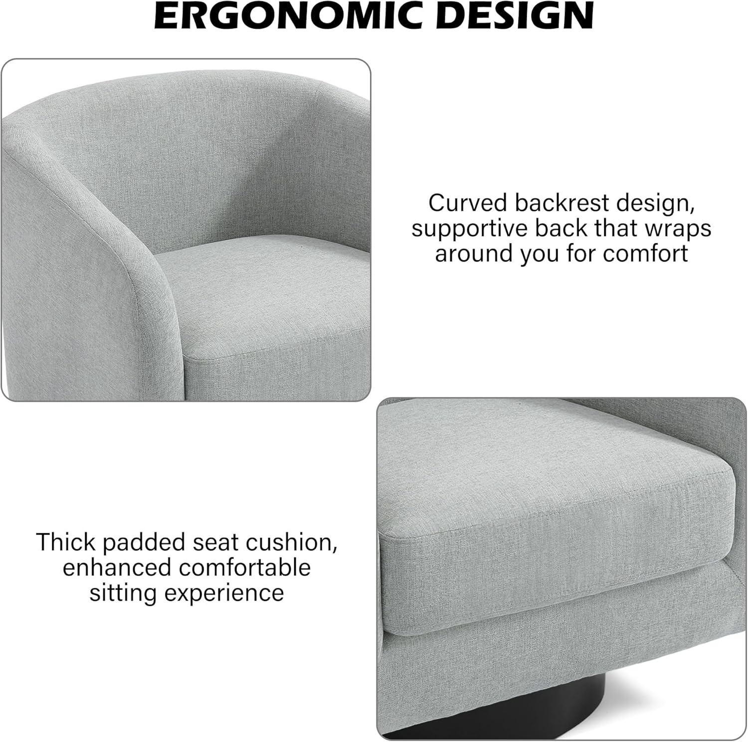 - 360 Degree Swivel Barrel Chair: This 360 degree round swivel chair designed for your leisure comfort. Heavy solid turntable, making it more stable and not wobbly