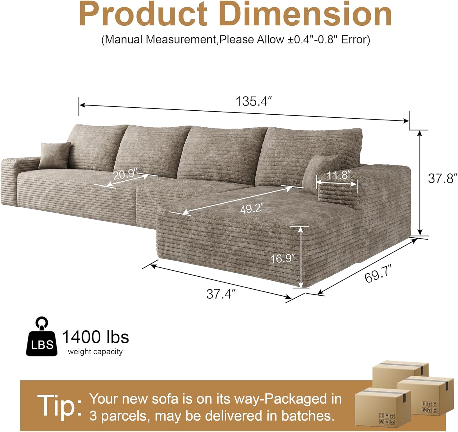 136" Sectional Couches for Living Room Modern Modular Sofa with L-Shape Couchs Upholstered Boneless Couch Deep Seat Sectional Couch with Chaise (Camel, Right Facing Chaise+3Seaters)