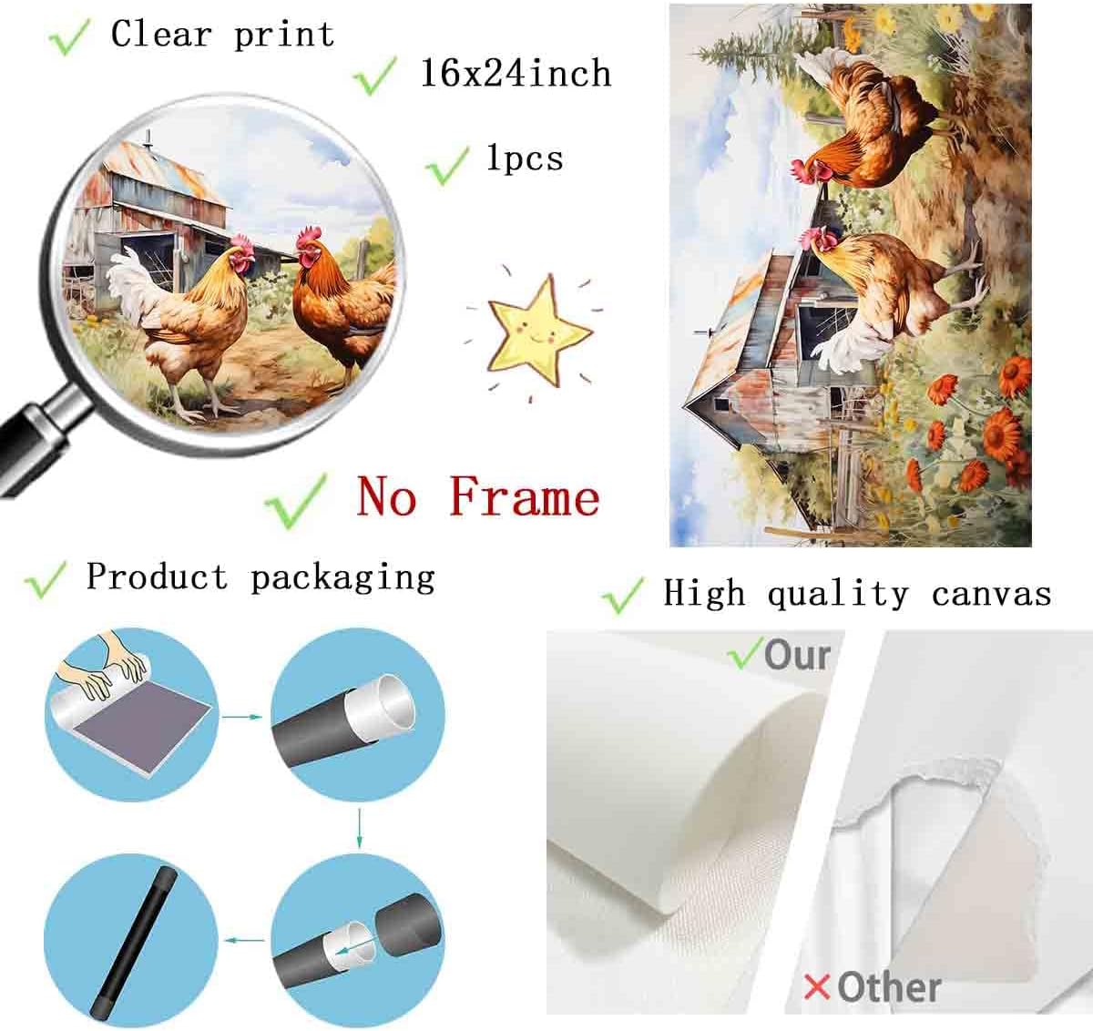 Chicken Farm Wall Art Rustic Country Painting Chickens Pictures Vintage Countryside Canvas Wall Art Barn Rustic Farmhouse Pictures Animals Wildflower Painting Living Room Decor 16x24inch No Frame