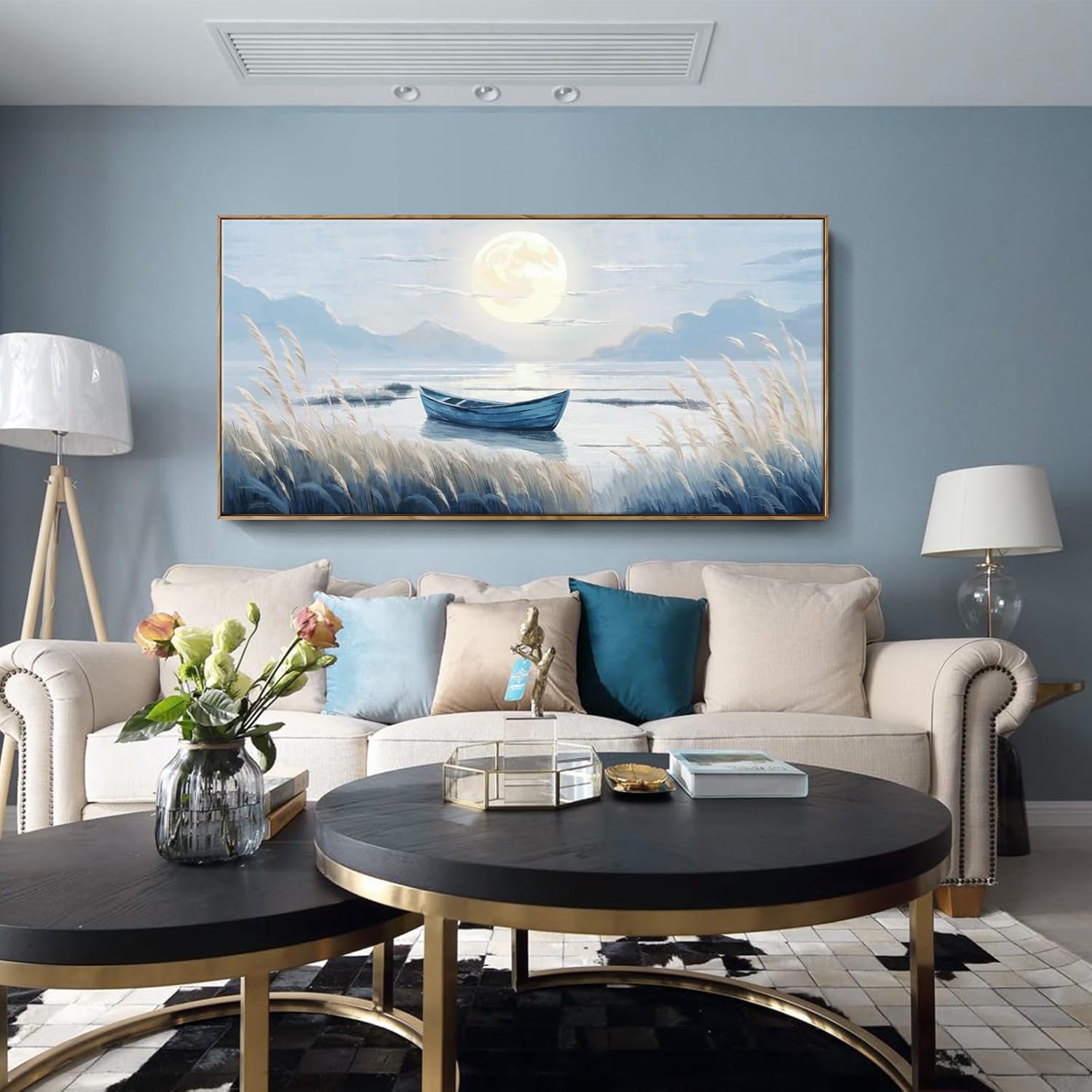 - ➤Serene Moonlit Boat Wall Art: This big framed artwork portrays a tranquil moonlit scene, featuring a lone wooden boat gently resting on calm waters, surrounded by swaying reeds and misty distant mountains. Rendered in soft blue and warm yellow tones, it evokes a sense of peace, romance, and timeless beauty, creating a serene retreat for any home decor style.