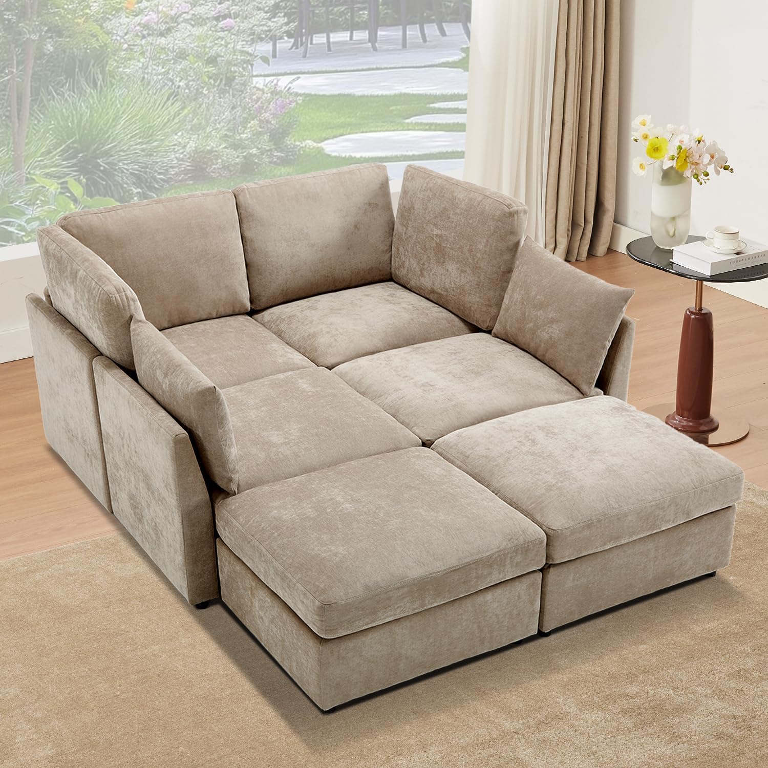 Tbfit U Shaped Couch, Sectional Sofa for Living Room,Chenille Cloud Couch with Ottoman 6 Seat, Khaki