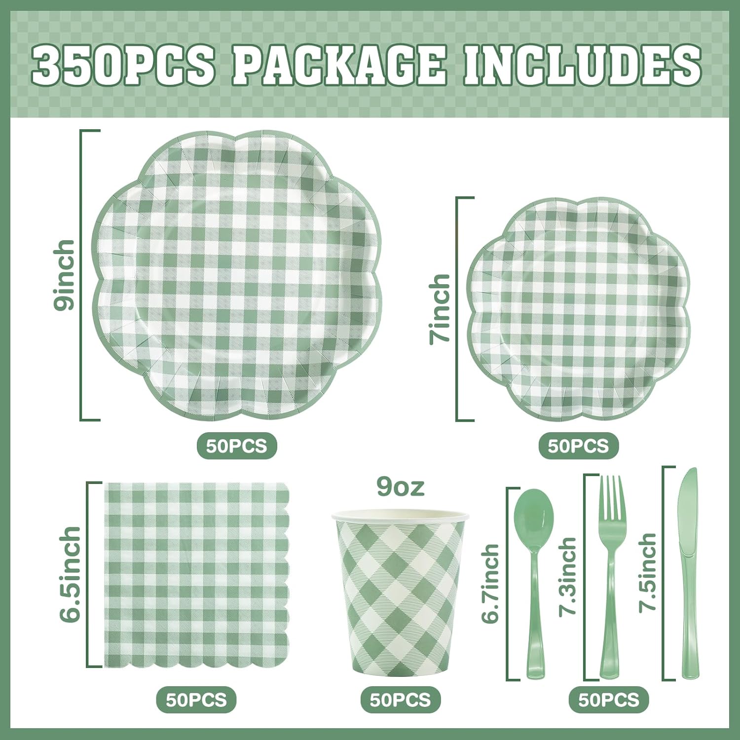- 【Serves 50 Guests】Sage green gingham plates sets includes 50pcs 9-inch sage green checkered dinner plates, 50pcs 7-inch sage green plaid dessert plates, 50pcs 9 oz gingham cups, 50pcs 6.5-inch scalloped gingham napkins and 50 sets of knives, forks, spoons for a total of 350 pieces. Perfect for all kinds of parties and celebrations