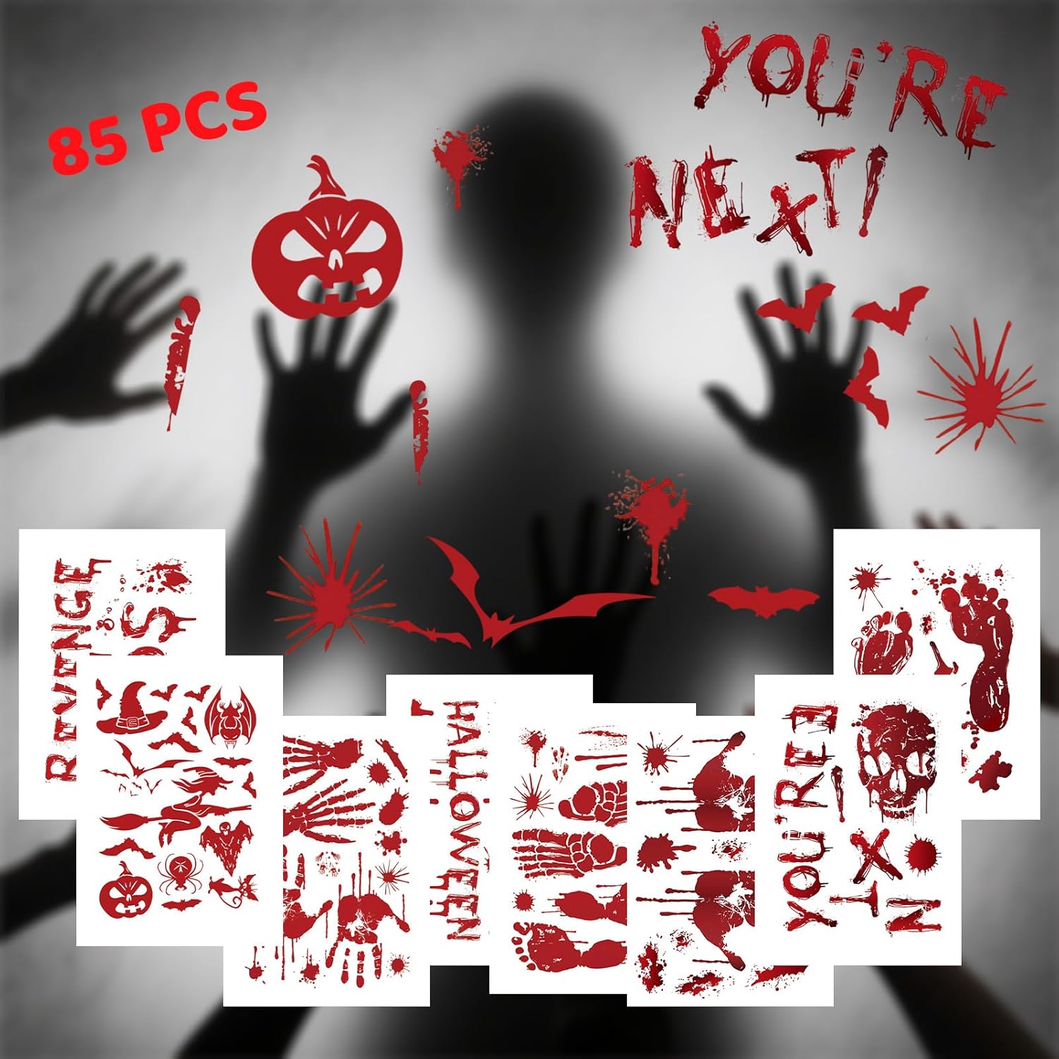 8 Sheets Halloween Window Clings, Bloody Handprint Footprint Window Stickers Scary Halloween Decorations Self Adhesive Wall Decal for Party Bathroom Car Door Zombi Restroom Sign Decals-85 Pcs