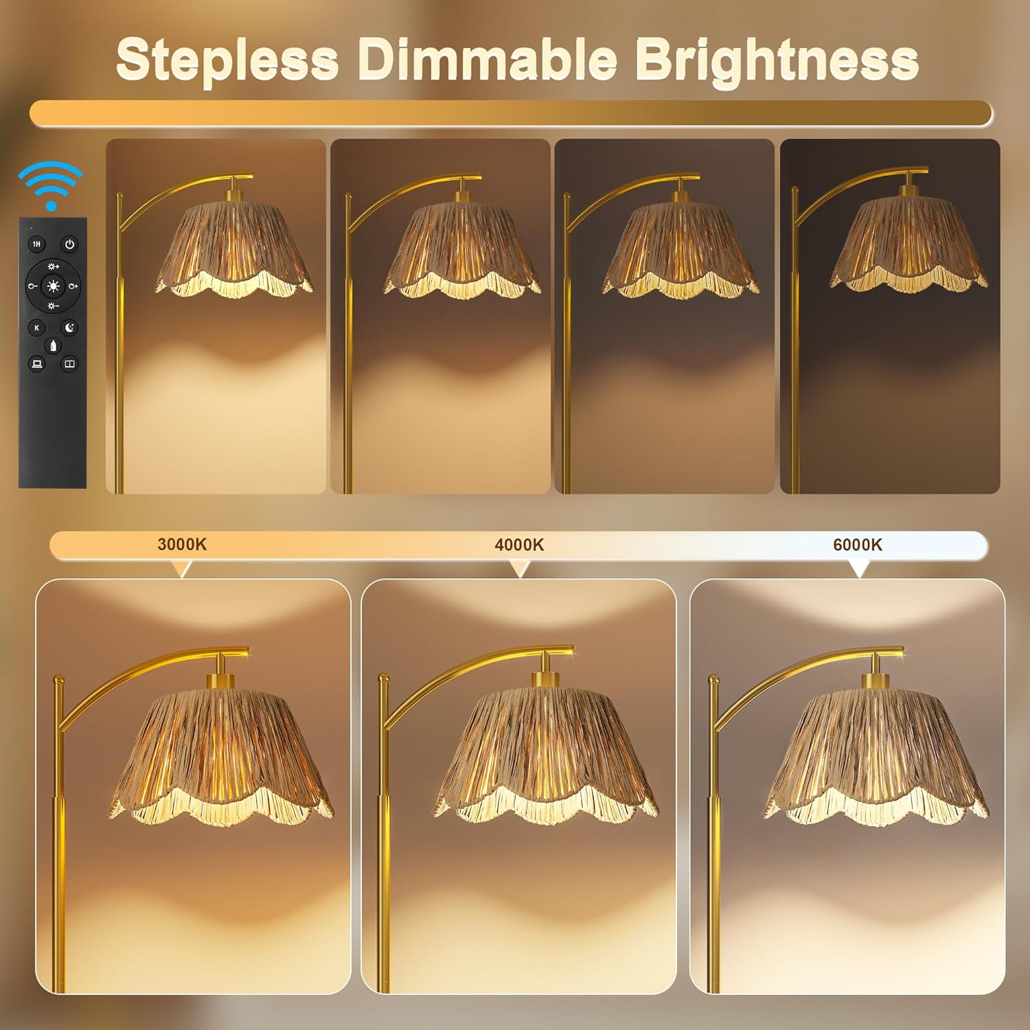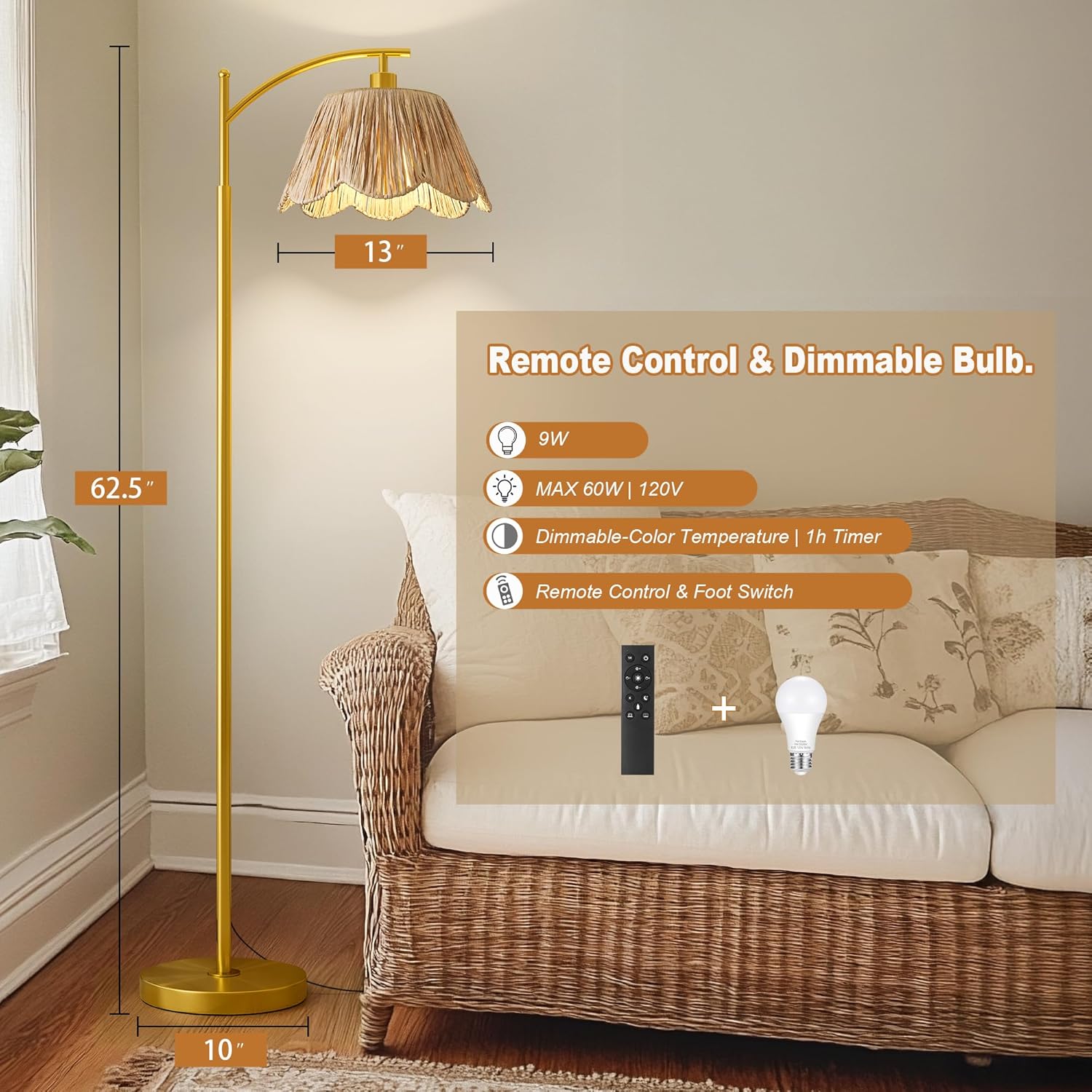 Oneach Boho Floor Lamp with 3 Color Temperatures, Farmhouse Floor Lamps for Living Room with Remote & Dimmable Bulb, Rattan Floor Lamp for Bedroom, Gold