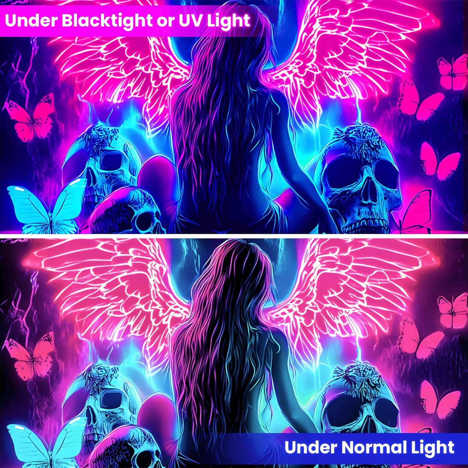 - 【Blacklight/UV Reactive】 Due to the special ink and advanced technology, the blacklight wing tapestry's colors can be changed under Black Light or UV Reactive Light. You can enjoy different effects by kinds of light, the tapestry will be amazing. Under normal light, the colors are also beautiful.
