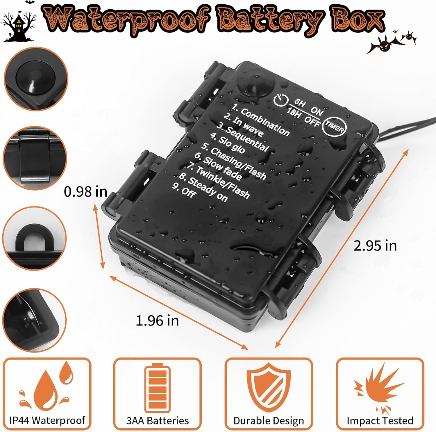 - ăSmart Timer FunctionăAutomatically turns on for 6 hours and off for 18 hours dailyâno manual switching needed. Saves energy while keeping your Halloween decor glowing all night!