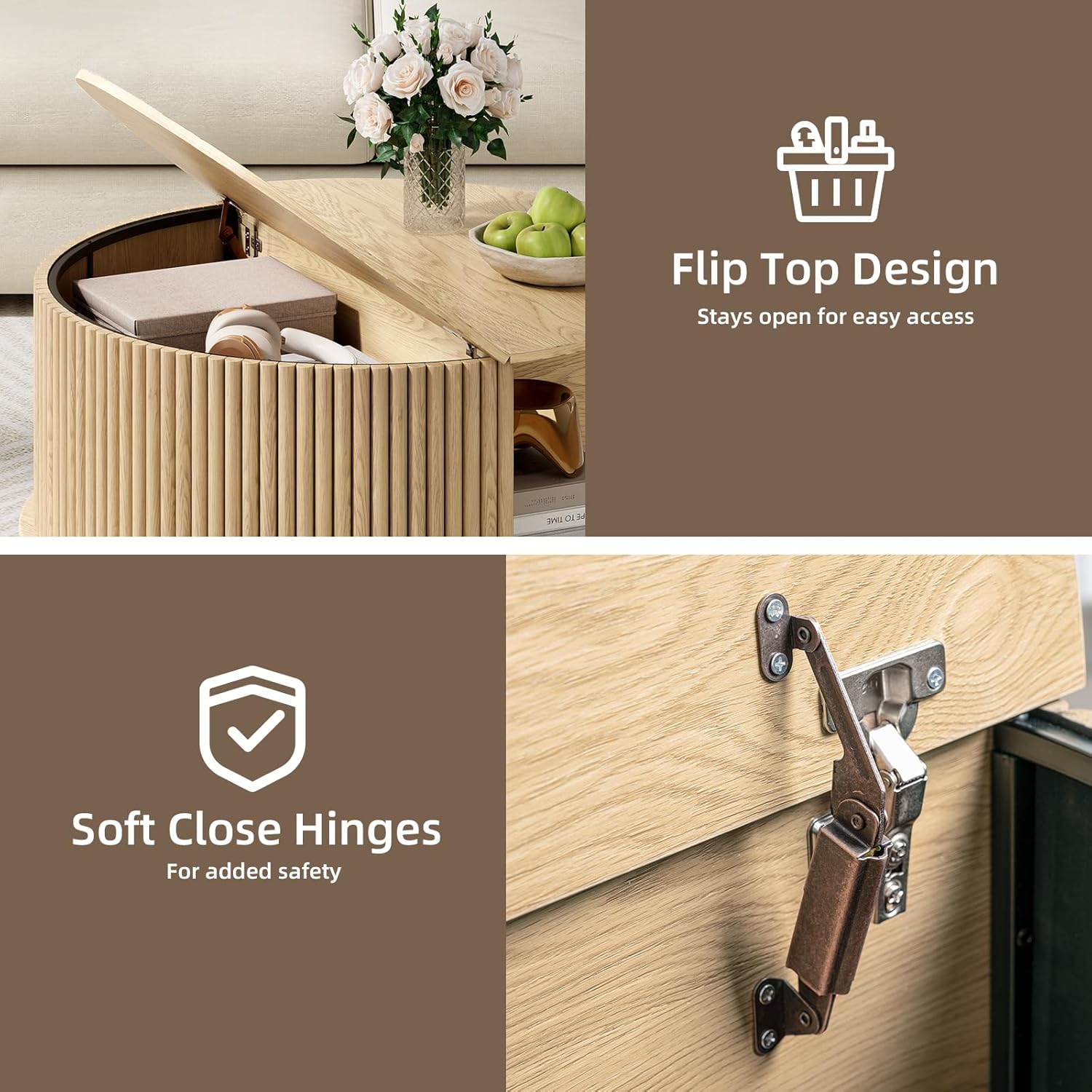 Round Coffee Table with Storage,Fluted Lift Up Coffee Table with Sliding Door,31.5" Drum Center Table with Bun Feet for Living Room,Home Small Space,Oak