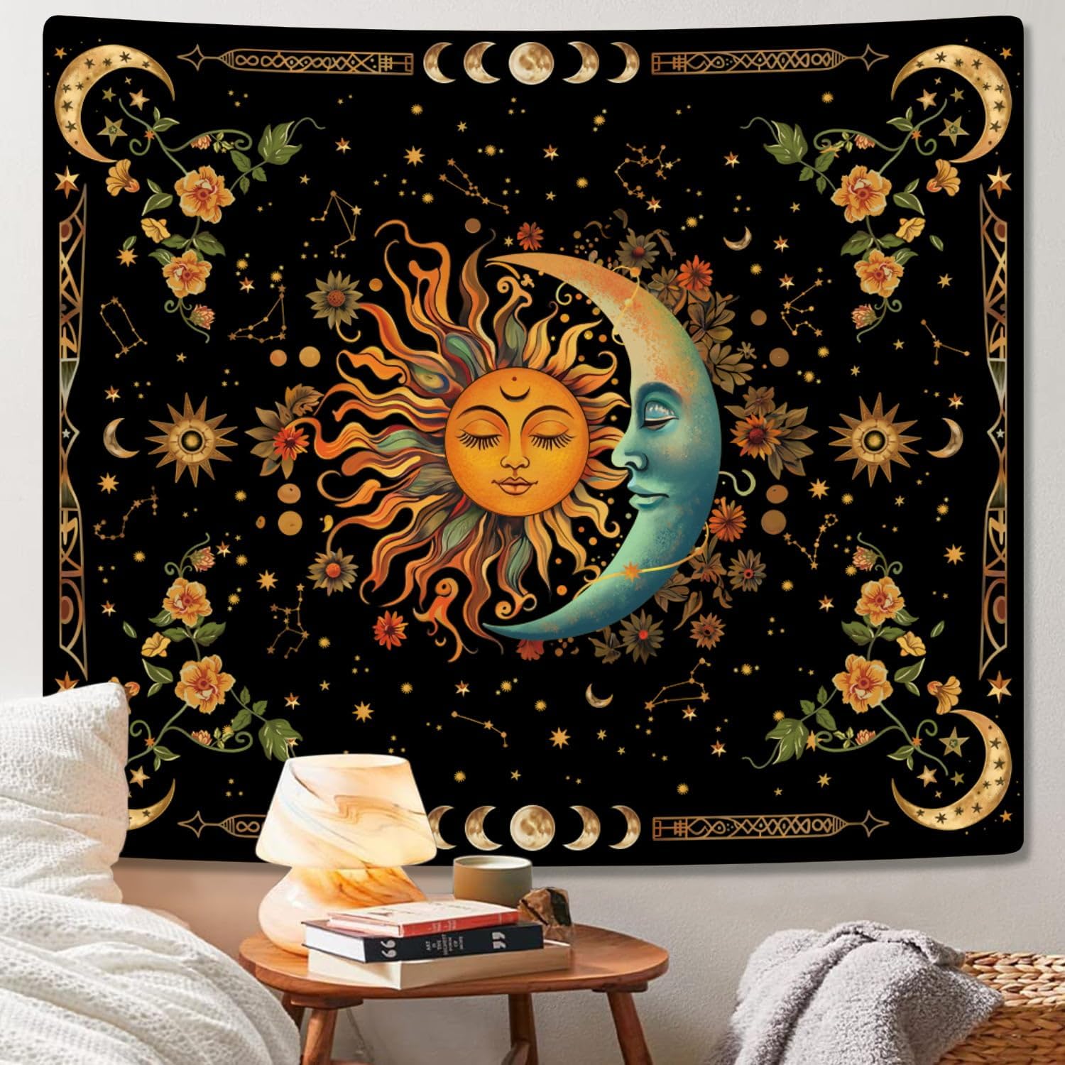 ARTCREATOR Sun and Moon Tapestry Astrology Space Wall Hanging Boho Hippie Floral Plant Tapestries Aesthetic Vintage Mandala Flower Decor for Living Room Bedroom (51" x 59")