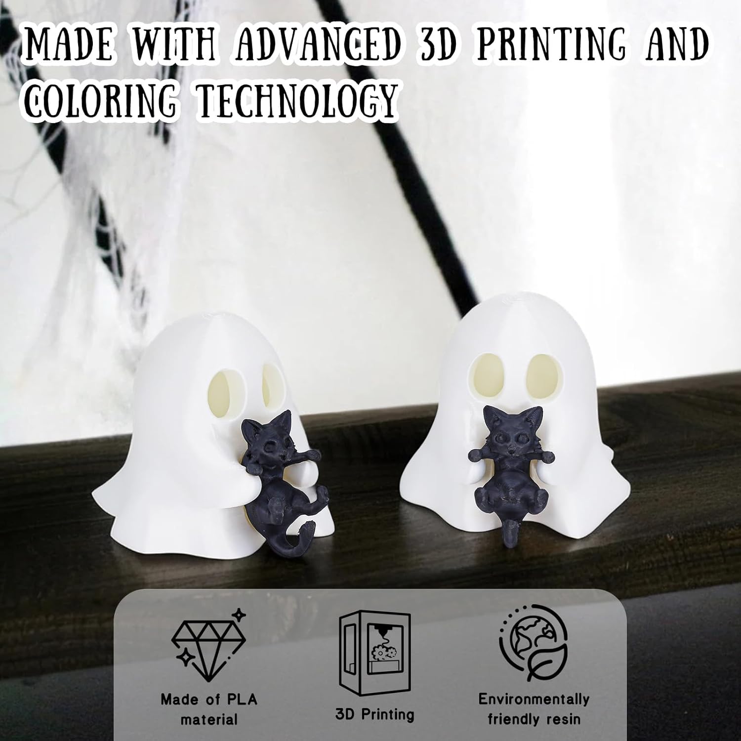 1 Pcs Halloween Ghost Figurine Cute Desktop Ornament Cute Cartoon Little Ghost Hugging Kitten Designs Resin Spooky Halloween Statue for Home Offince Art Display Decor Suppies