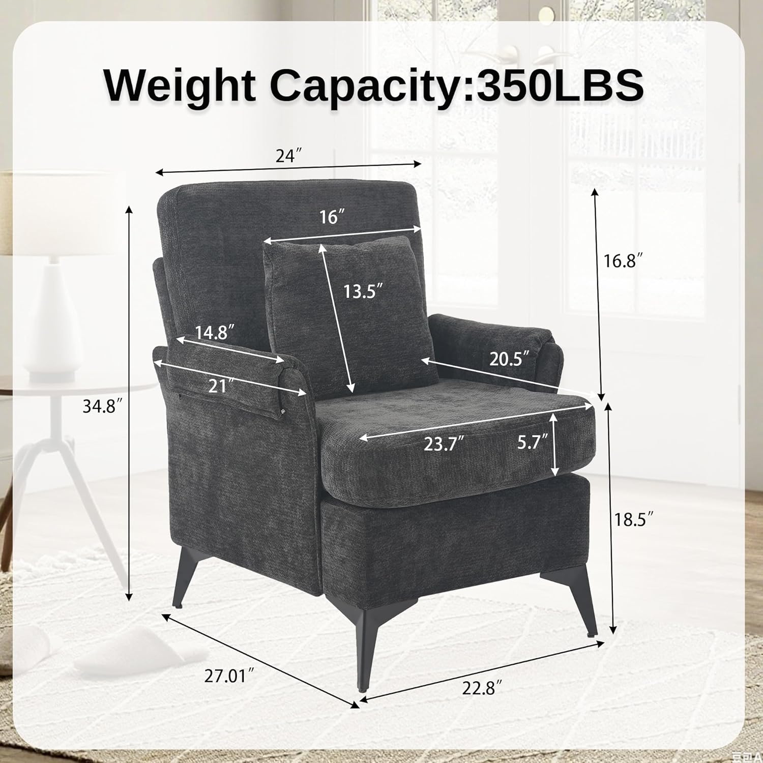 - Sturdy Metal Legs: This armchair's legs are made from metal, ensuring a stable and comfortable sitting experience that will last for years to come. Additionally, the legs are equipped with plastic foot pads to protect your valuable wood floors from scratches. The maximum loading capacity can be reached at 350lb