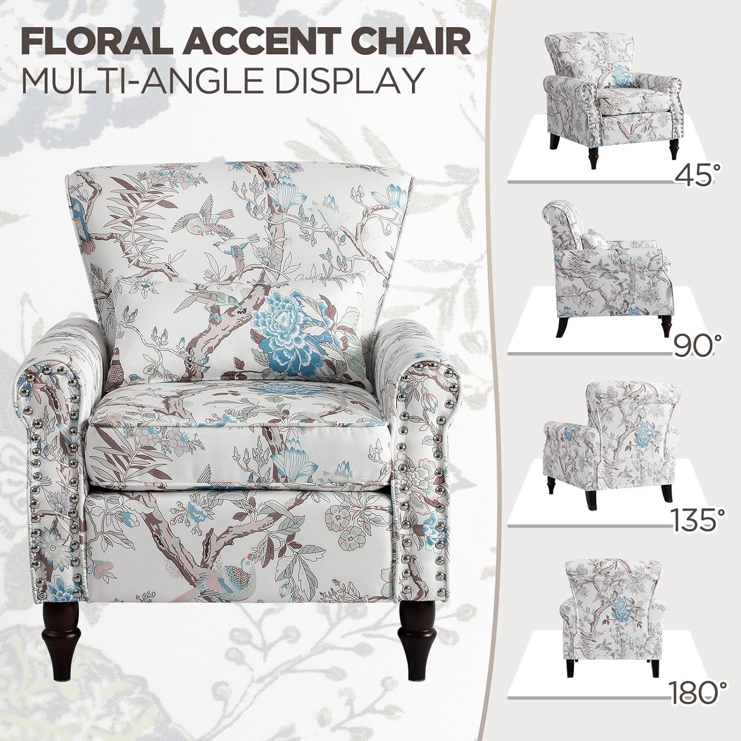 Wingback Accent Chair with Removable Pillow, High Back Floral Armchair with Solid Wood Legs & Nailhead Trim, Comfy Upholstered Reading Single Sofa Chair for Bedroom (1, Bird Floral Pattern)