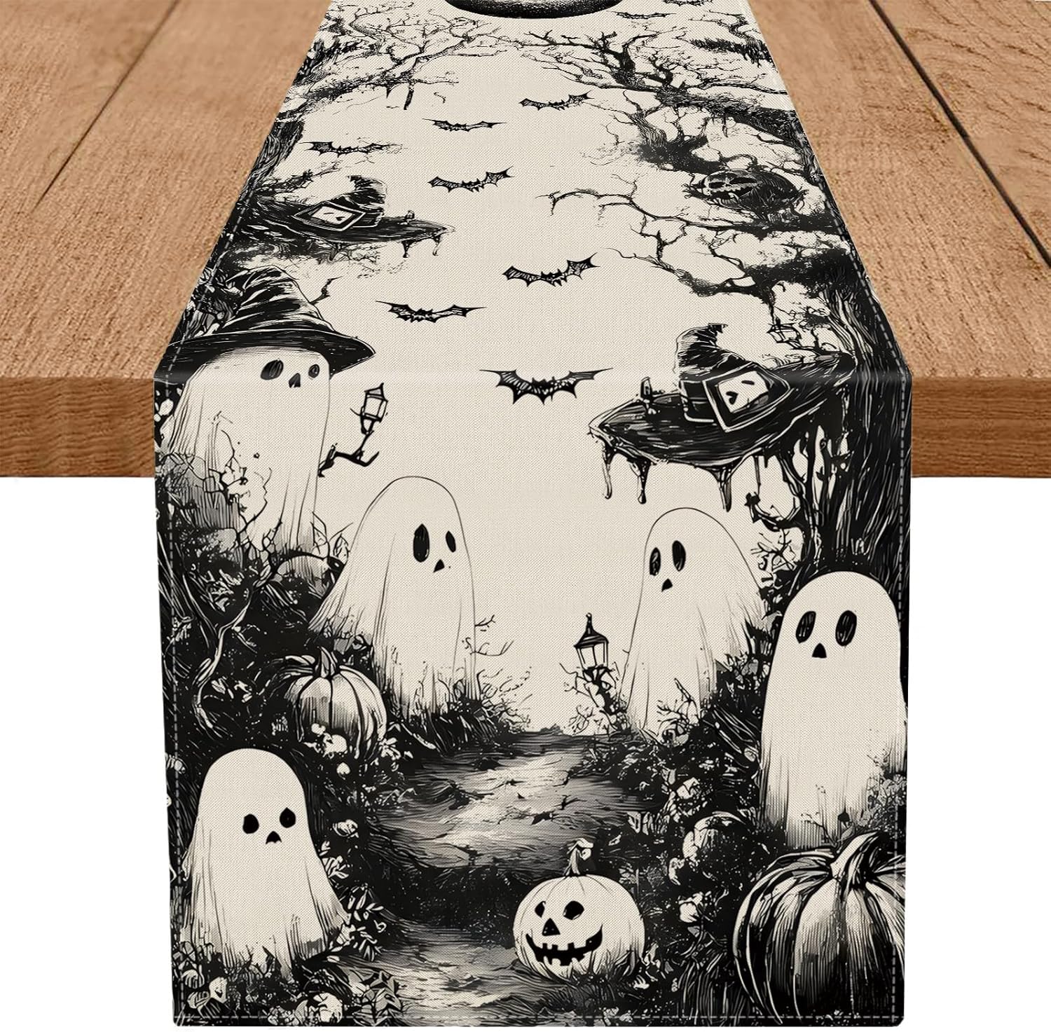 GPGHE Halloween Table Runner Black Ghost Holiday Burlap Table Decoration Indoor Outdoor Home Decor Party Supply 13 x 108 Inch