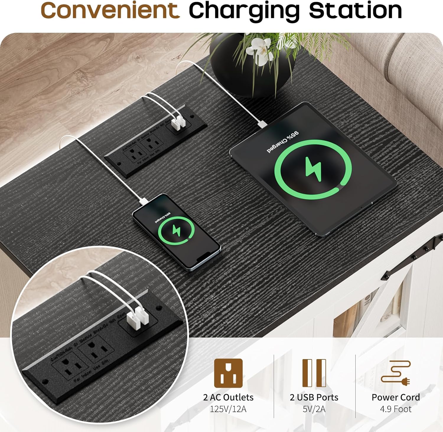 - ăNight Stand with Charger StationăEquipped with 2 AC outlets and 2 USB ports, this white night stand powers up to 4 devices at once, like your phone, laptop, tablet, and lampâalways charged, always ready. The 6.5ft power cord plugs into wall outlets easily, ensuring hassle-free charging.