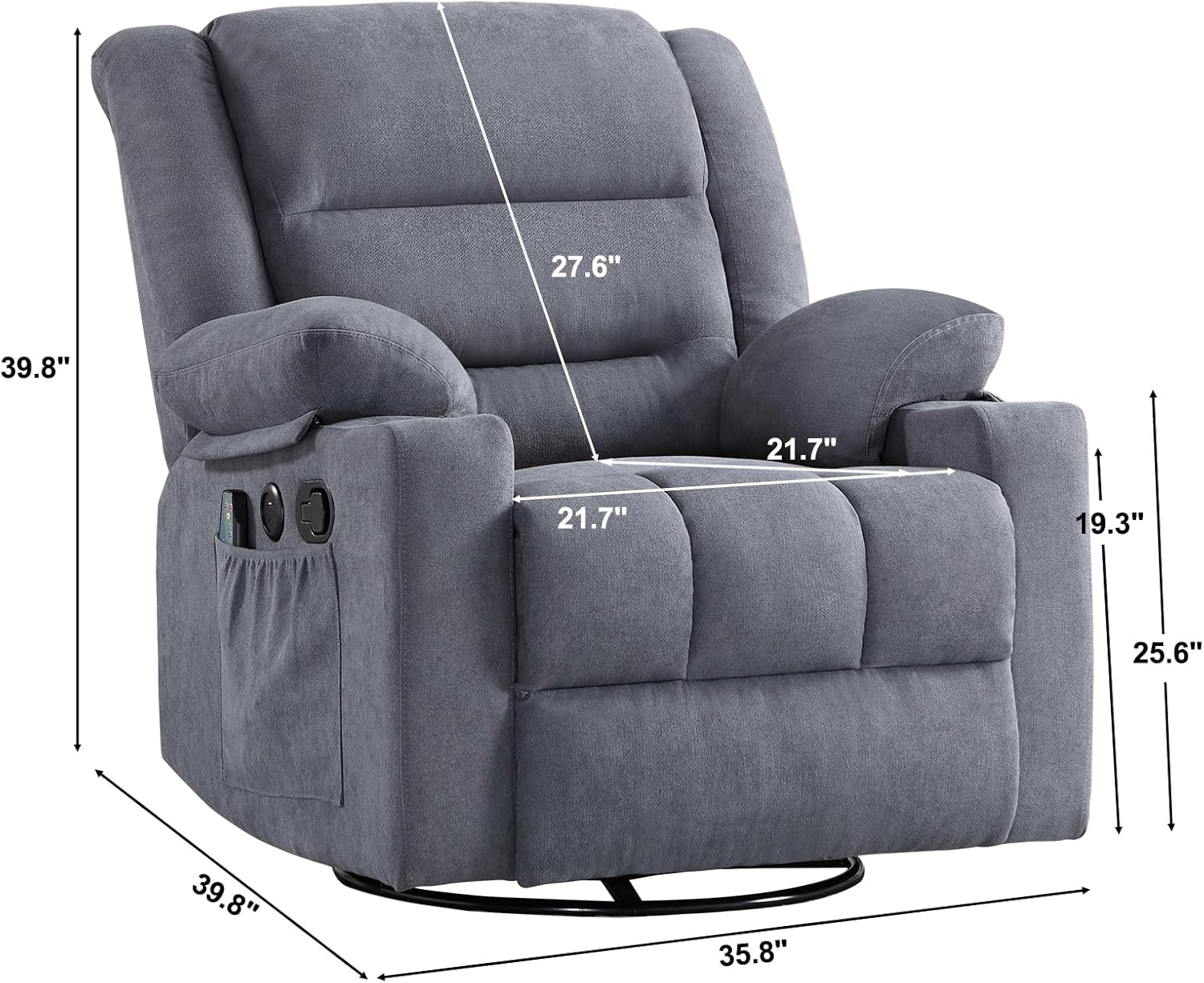 Rocker Recliner Chair with Heat and Massage, 360° Swivel Recliner Chairs for Adults, Heavy Duty Reclining Sofa Chair with USB Port Cup Holders Side Pockets for Living Room (Grey)
