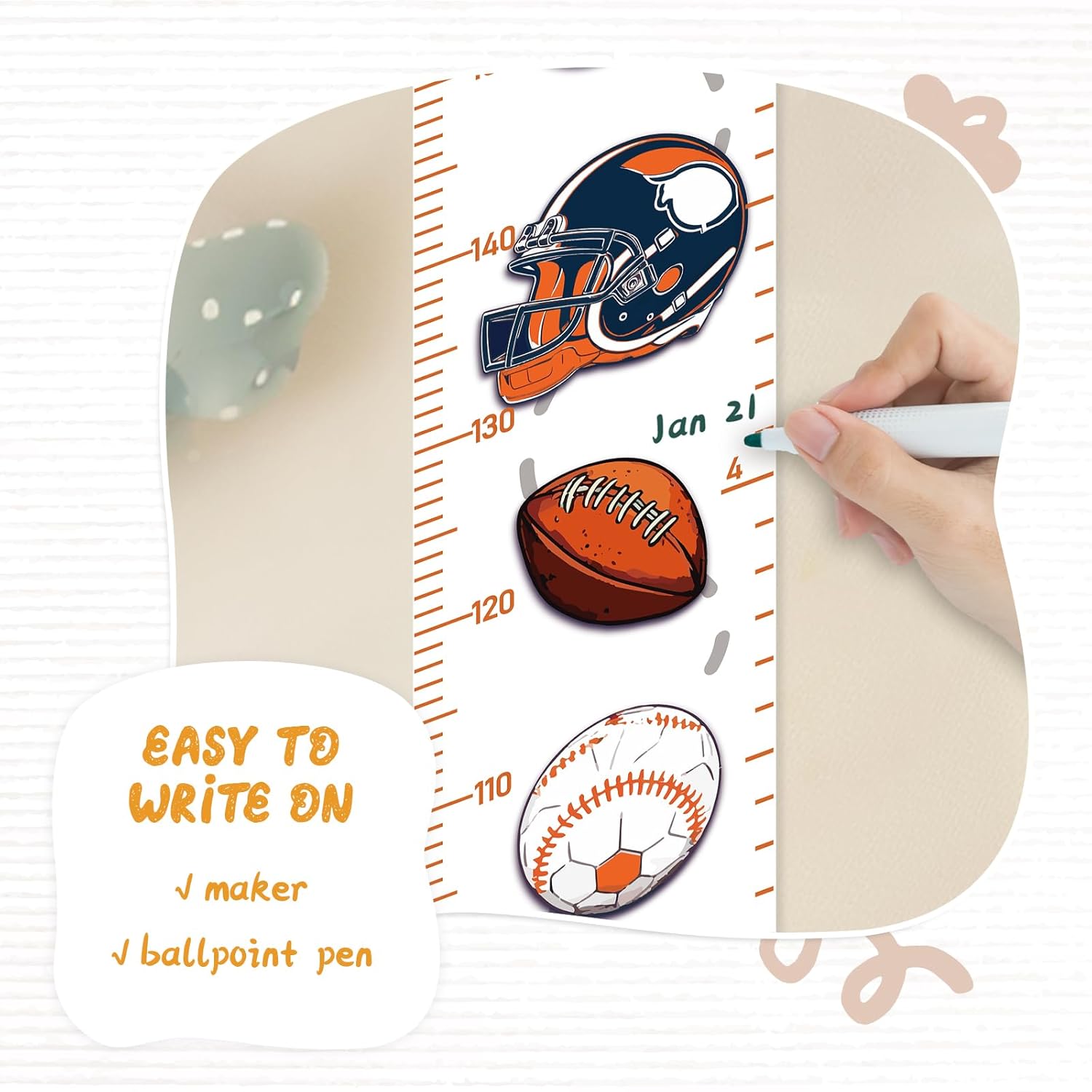 - Design: Kids growth chart with rope at the top of the chart, easy to install and removeable, foldable and portable design, easy to store, hang, roll up, transport, and save space. It boasts a material that's easy to write on, where you can use dark colored ballpoint pens and markers to track growth milestones.