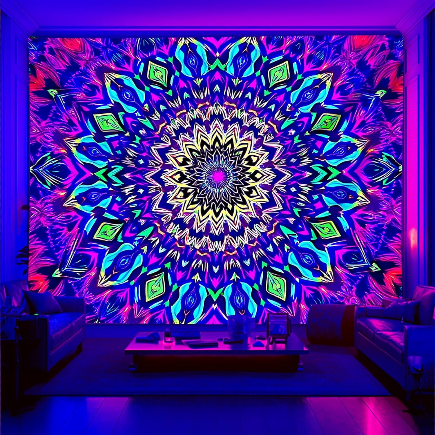 Blacklight Mandala Tapestry for Bedroom, XL Black Light Posters for Adults and Teens, Colorful UV Reactive Aesthetic Bohemian Wall Art Decor (90 x 70 Inches)