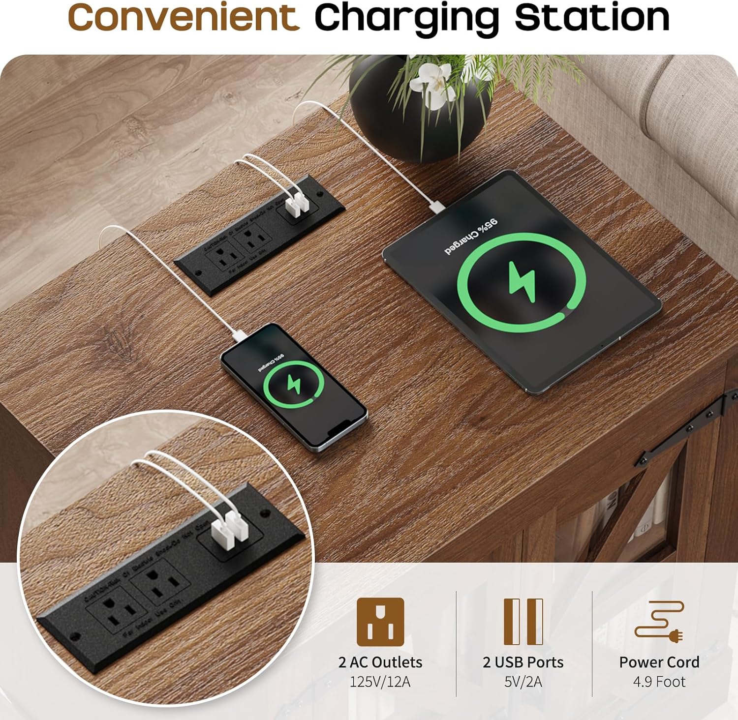 Farmhouse Side Table - 24" Large Night Stand Set 2, Wood Nightstand with Charging Station, Bedside Table with Adjustable Shelf, End Tables Living Room, Rustic Bed Side Tables Bedroom, Walnut