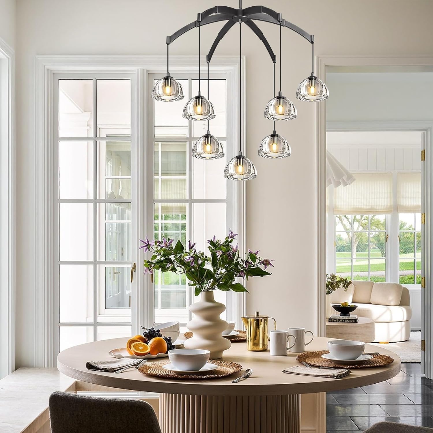 - Sleek Round Modern Design: The circular Black frame and seven transparent glass shades create a minimalist yet bold statement. Ideal as a modern chandelier or round chandelier, its clean lines add architectural sophistication to any space.
