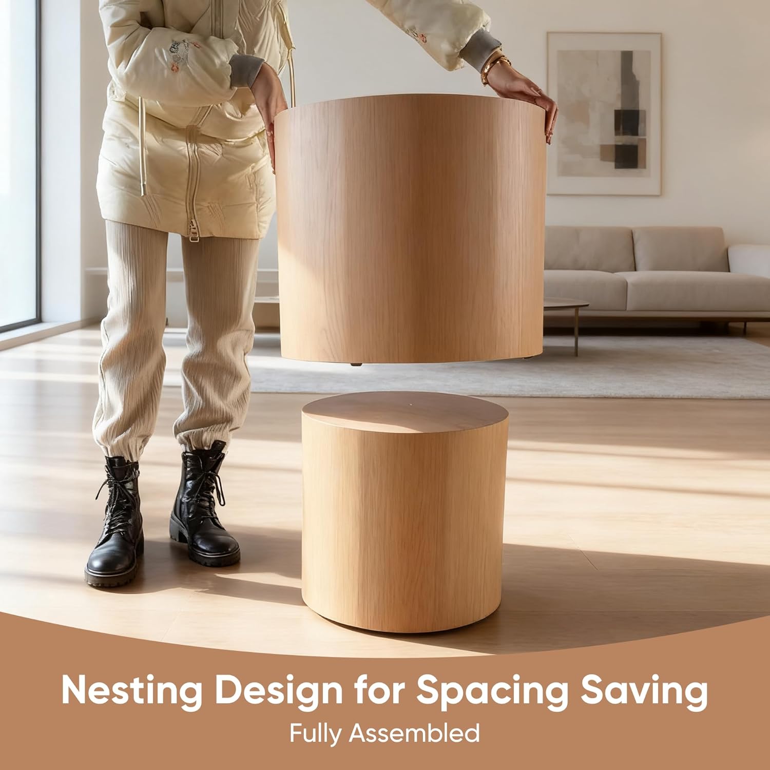 Nesting Round Coffee Table Set of 2, Small Circle Accent End Table for Small Spaces, Morden Drum Side Table, Wooden Center Table for Living Room, Fully Assembled - Natural